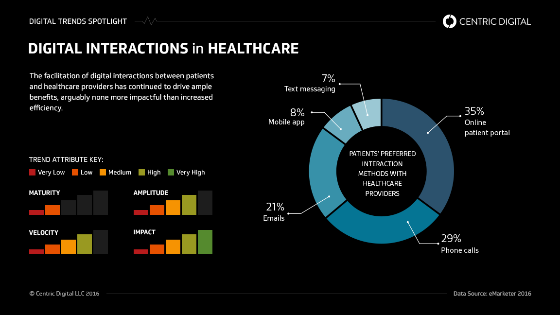 Cigna developed "Compass," its technology-based guidance system, to help its customers at JPMorgan Chase "develop a culture of health ... and make wellness a part of their everyday lives." Compass synthesizes disparate consumer data, including medical plan use, physical activity, biometric data, incentive information, claims history and coaching program involvement. All this information is integrated into a predictive analytics program, thereby providing members with personalized alerts regarding opportunities to improve their health and reduce expenditures.The evolution of the healthcare industry is a work in progress, but two aspects of that evolution are already very clear: First, any method for reducing the cost of delivering care will be readily embraced in the industry as long as patient outcomes continue to improve. Secondly, the healthcare consumer is gaining greater power to make choices. This means that in order to be competitive, healthcare providers must attend to customer preferences and deliver pleasing, streamlined patient experiences. The digital transformation of healthcare is still in its early days, but it will continue to penetrate the industry at both macro and micro levels. Profitability for providers of any size will depend on their ability to leverage the array of new digital tools.