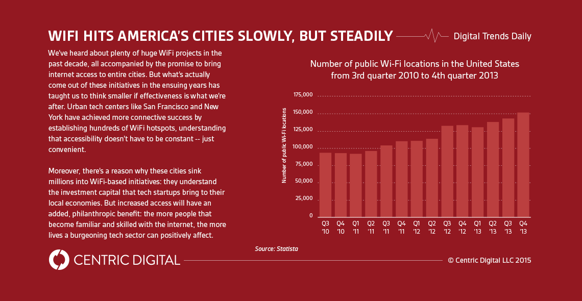 The story of municipal projects to bring public WiFi to the underprivileged and impoverished has been one of varied success.Some ambitious attempts at creating city-wide internet access zones, like the one Philadelphia made in 2004, according to the New York Times, have quickly turned sour.Meanwhile, Digital India, an even more ambitious project championed by Prime Minister Narendra Modi, has enjoyed plenty of success, bringing internet access and cloud sharing to parts of the country where people had never even seen a webpage, as First Post reports.And earlier this month, Mayor Bill de Blasio announced that his administration plans to spend $70 million on efforts to give free internet access to all New Yorkers, according to Fast Company. This makes sense, as NYC has already had some success introducing smaller hotspots in a handful of areas, making access convenient for consumers and manageable for administrators.On the one hand, the initiative is a continuation of the previous mayor Michael Bloomberg’s attempts to court the tech industry, attempts that have put New York behind only San Francisco on the list of cities deemed most hospitable to tech startups while bringing in millions of dollars in investment and revenue.On the other hand, the idea also smacks of the kind of populism that put de Blasio in office.By bringing WiFi and the internet to the swaths of New York’s population that can’t afford it, the mayor is not only democratizing what’s becoming more and more of an essential resource, but expanding the scope of the tech sector’s economic impact.