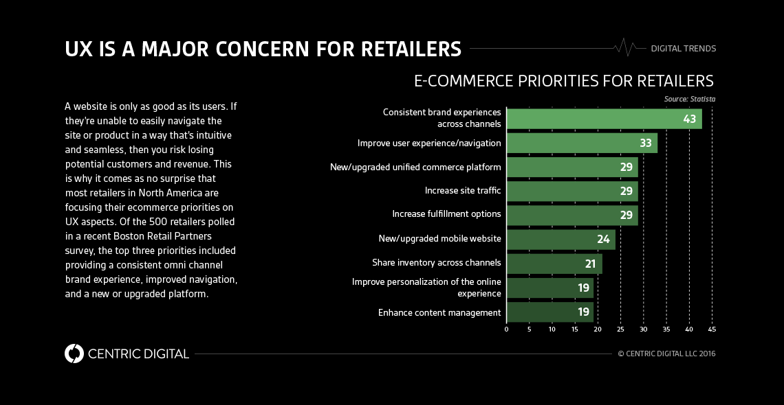 Designers must consider the omni channel user experience that their client provides and avoid falling into the trap of focusing too narrowly on the particular website or app that they have been hired to create. For example, a designer whose primary goal is to create an e-commerce website for a major retailer shouldn’t forget that some customers prefer to buy their goods in a brick-and-mortar store. The designer may be able to help these customers out by including a feature that allows users to see whether particular items are in stock in their local store, in addition to the usual option to buy online.